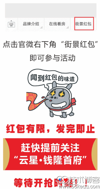 微信扫描下面二维码关注:云星钱隆首府,点击菜单栏:街景红包,点击推送进入微信内有奖活动页面,参与街景找红包